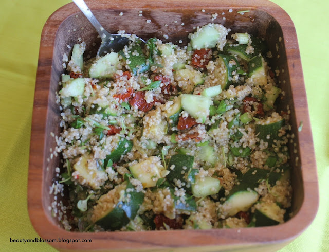 Wczoraj byłam na zakupach i w moim koszyku wylądowało mnóstwo warzyw. Ze sklepu wyszłam z dwoma pełnymi torbami pomidorów, ogórków, cukinini, zielonej fasolki, sałaty, papryki i świeżych ziół. Po powrocie od razu więc wzięłam się za przygotowanie pysznej sałatki z cukini i quinoa czyli komosą ryżową. O cudownych właściwościach QUINOA już Wam pisałam http://beautyandblossom.blogspot.co.uk/2013/06/magiczna-quinoa.html A, że warzywa warto jeść zwłaszcza teraz gdy są świeże nikogo chyba przekonywać nie trzeba. Tak więc dziś w moim cyklu sałatkowym